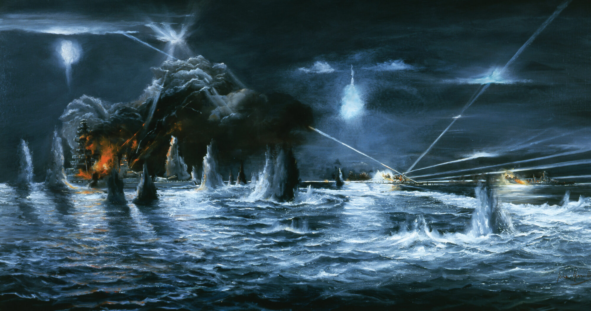 At seven minutes past midnight, exactly seven minutes after opening the battle with Kirishima, Washington ceased firing. Admiral Samuel Eliot Morison’s assessment agrees with that of Kirishima’s assistant gunnery officer: “Nine out of 75 sixteen-inch shells from Washington scored, as did about 40 fast-shooting 5-inchers.”