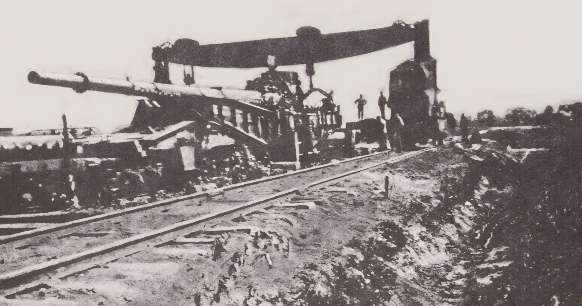 Nevertheless, the work was a major engineering undertaking. The gun was a composite affair, a complex assemblage produced by the renowned Krupp design teams. There was a barrel extension of 36 feet, 1 inch, forward of the original muzzle. On top of this was an additional chase (smoothbore) extension of 19 feet, 8 inches. The entire affair had an overall length of 112 feet, and a weight of 138 tons. Such a ponderous piece of artillery required external bracing to keep the barrel from sagging. Supporting the barrel was a cantilever bracing that transferred part of the load to the base of the gun. The bracing looked very much like a model of one-half of the Brooklyn Bridge. Obviously this apparatus could be carried only on railroad wheels and required the special construction of reinforced trackage.